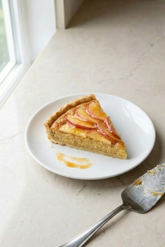 - How to arrange the apples: Slice the apples thinly and evenly so they cook through at the same rate. Overlapping them slightly ensures every bite has fruit and protects the frangipane from drying out.
