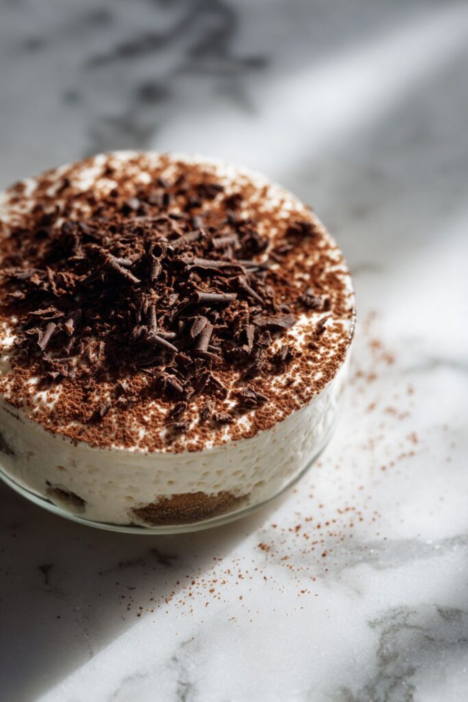 - Serve: Just before serving, grate the dark chocolate over the top and dust generously with cocoa powder.