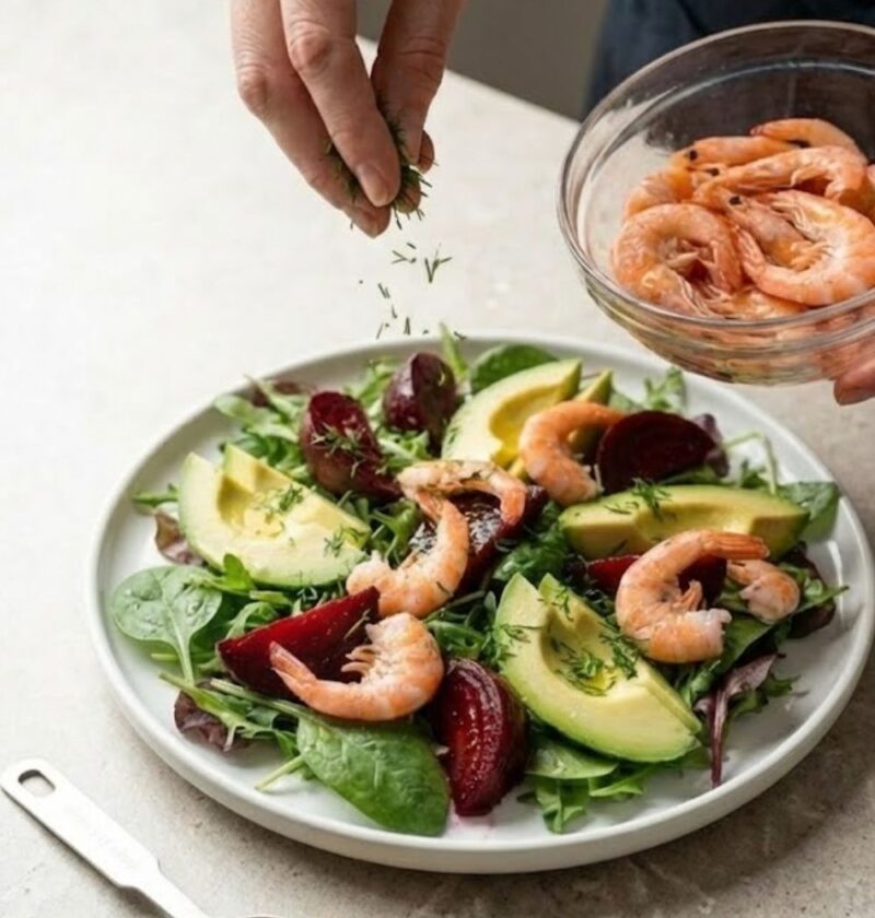 A sophisticated and visually stunning salad featuring sweet prawns, earthy beetroot wedges, and creamy avocado in a zesty lemon-dill vinaigrette.