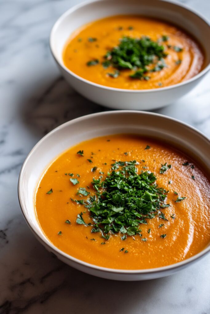 A vibrant, zesty soup combining sweet carrots with toasted coriander seeds and a hint of orange.
