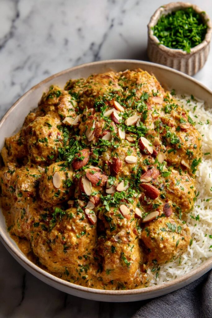 A classic, mild, and creamy chicken korma made with tender chicken, ground almonds, and a gently spiced yogurt sauce.