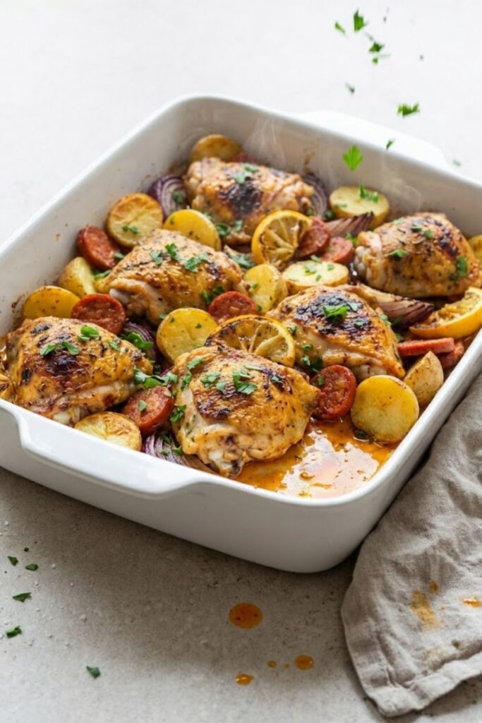 A hassle-free one-pan dinner featuring golden chicken thighs, roasted potatoes, and red onion flavored with smoky chorizo and paprika.