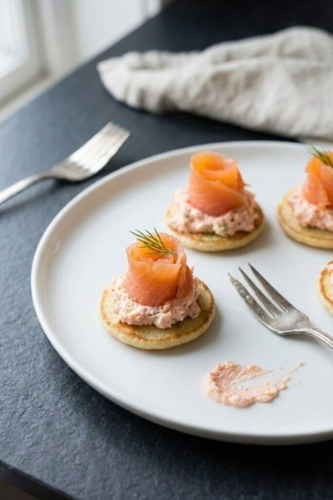 - Assemble the canapés: Spoon a teaspoonful of the salmon cream mixture onto each blini. (For a neater look, you can pipe the mixture using a piping bag with a large nozzle).