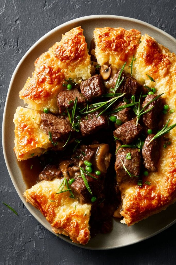 A classic, deep-filled British steak pie with a rich mushroom gravy and a golden puff pastry crust.