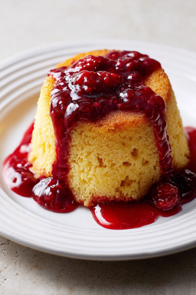 A classic, comforting British steamed pudding featuring a light vanilla sponge and a sweet, molten jam topping.