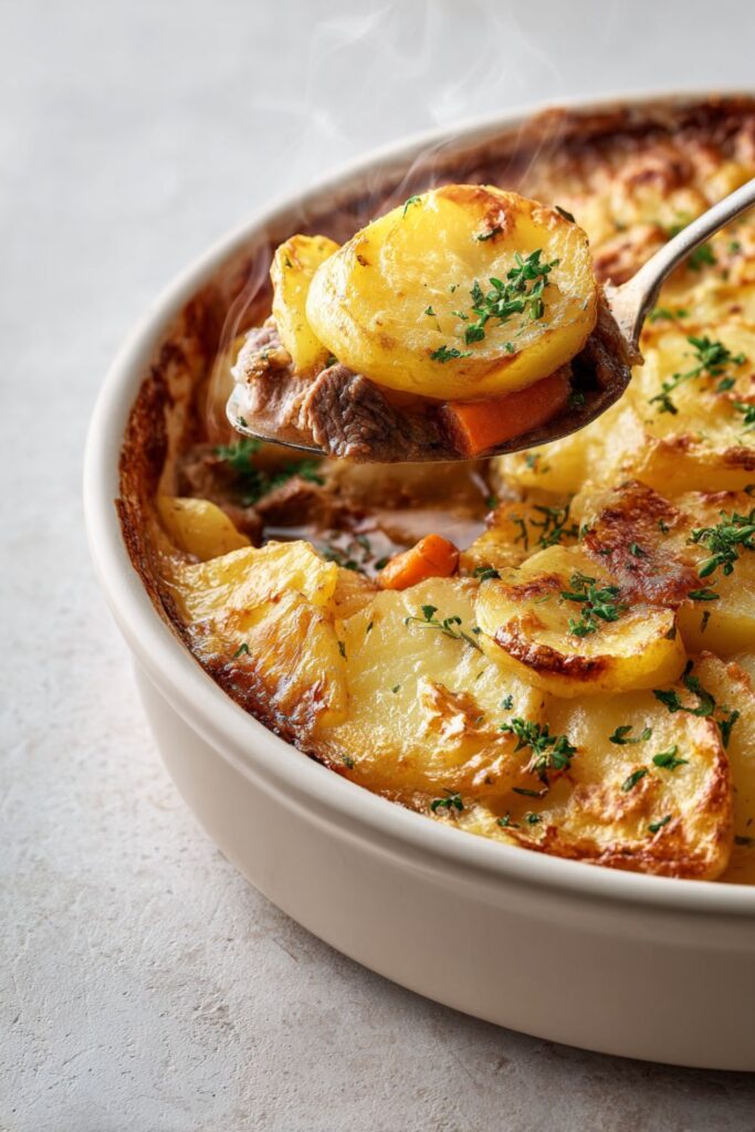 A comforting lamb and vegetable stew topped with a golden, crispy layer of sliced potatoes.