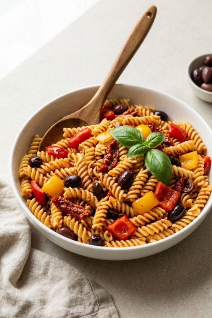 A rich and tangy pasta salad featuring sun-dried tomatoes, olives, and a signature tomato-oregano dressing.