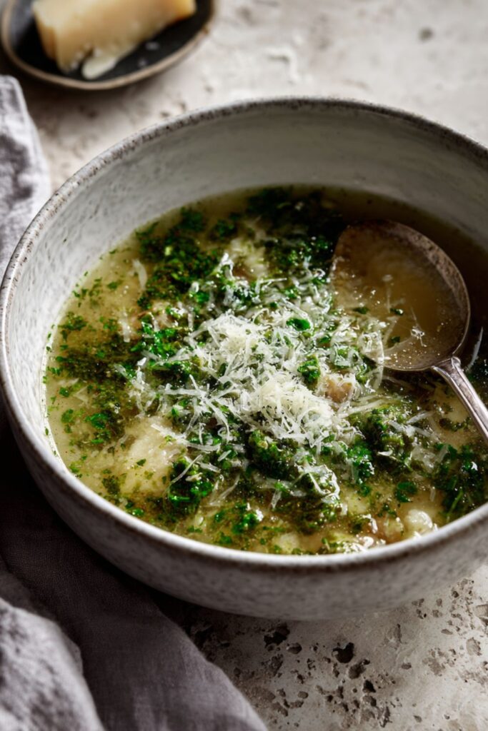 - Finish and Serve: Check the seasoning. Ladle the hot soup into bowls. Top each serving with a generous spoonful of pesto and a dusting of grated Parmesan cheese.