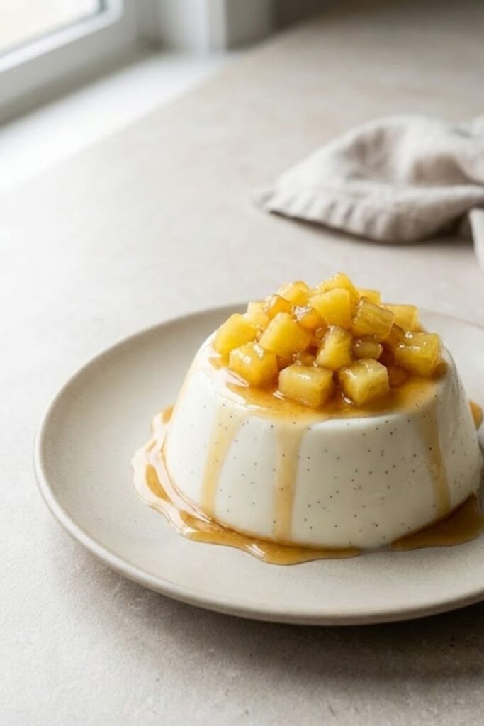 A silky vanilla cream dessert topped with a warm and spicy pineapple-ginger compote.