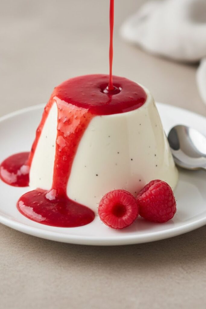 A silky, vanilla-infused Italian custard dessert served with a sharp raspberry coulis.