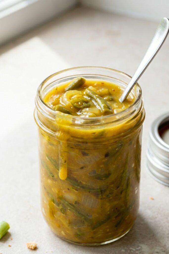 A traditional yellow mustard-spiced chutney made with tender runner beans and onions, thickened to a glossy consistency.