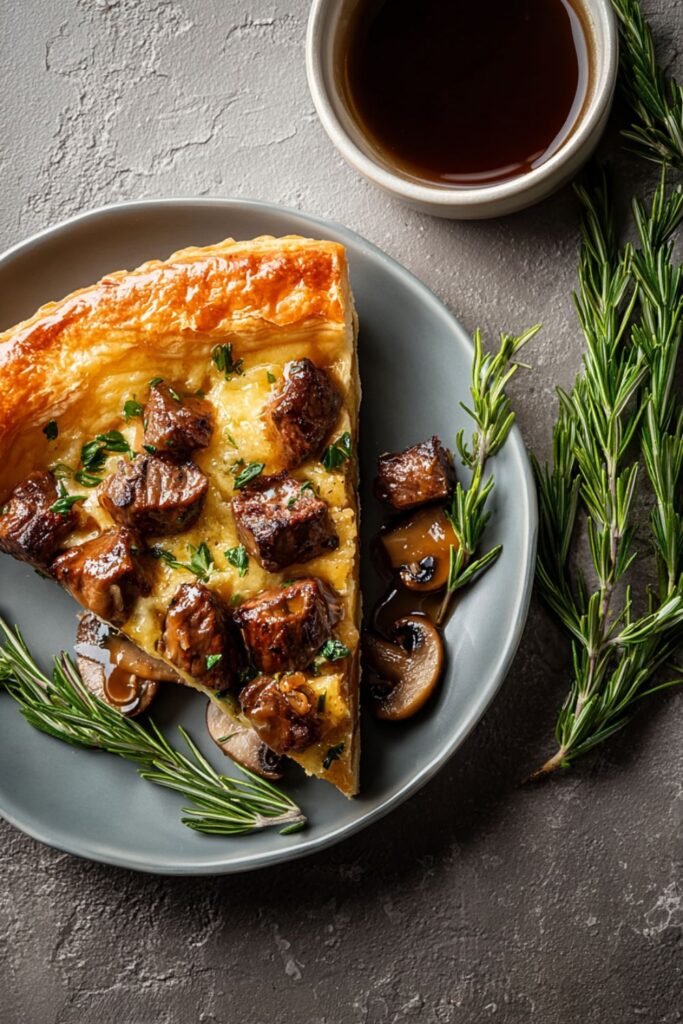 A classic British comfort pie featuring tender braised beef and savory chestnut mushrooms in a rich gravy, topped with flaky puff pastry.