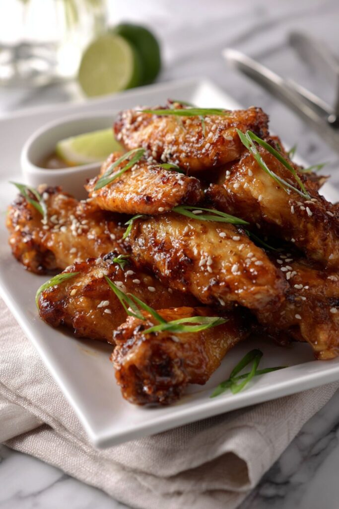 - Garnish and Serve: Let the wings rest for 5 minutes. Transfer to a serving platter and garnish with toasted sesame seeds and sliced spring onions before serving hot.