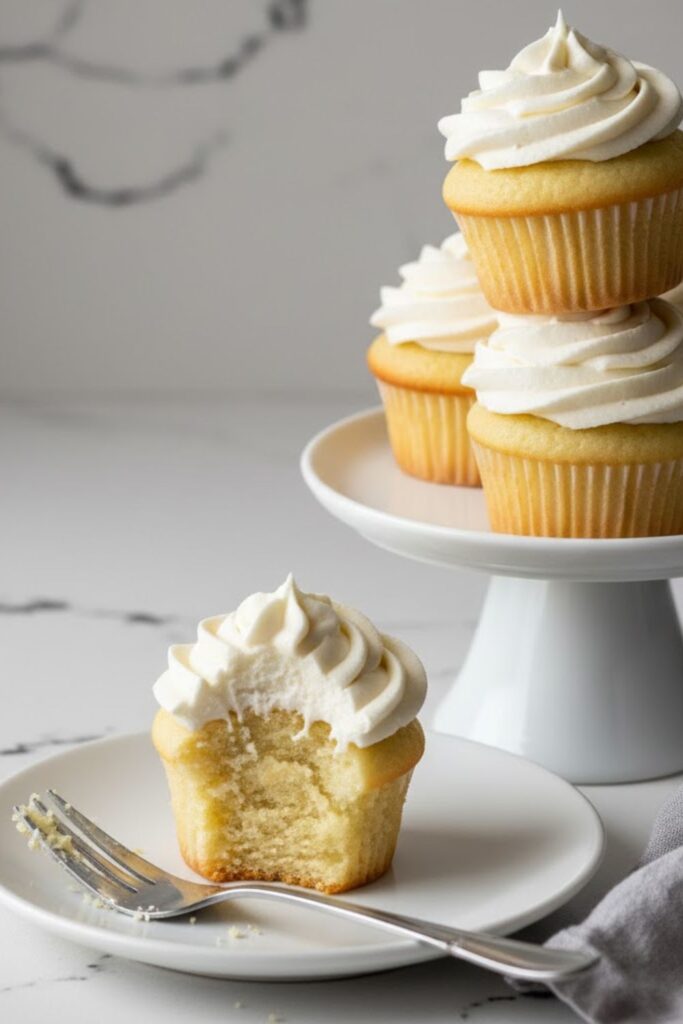 A foolproof vanilla cupcake recipe using the all-in-one mixing method for a light sponge, topped with fluffy vanilla bean buttercream.